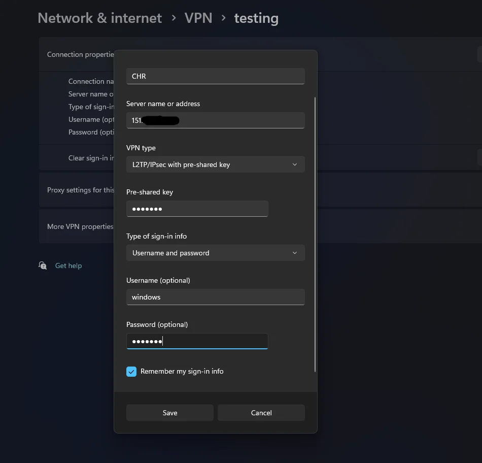 Pada kolom Server name or address, masukkan IP publik CHR. Kemudian, pada kolom Pre-shared key, isi dengan IPsec key yang telah dibuat saat mengaktifkan service L2TP Server di VPS MikroTik CHR.