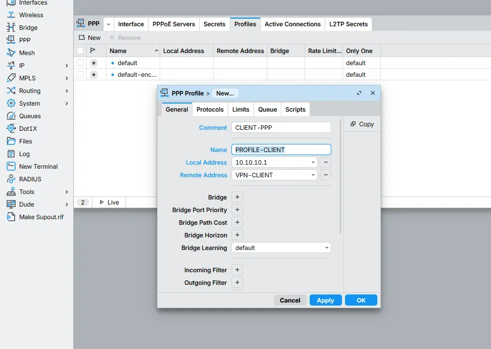/ppp profile add name=PROFILE-CLIENT local-address=10.10.10.1 remote-address=VPN-CLIENT comment=CLIENT-PPP