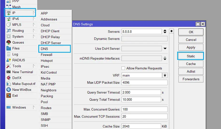Untuk menambahkan DNS static, masuklah ke menu IP → DNS, lalu pilih bagian Static. Penambahan DNS static ini bertujuan agar page isolir dapat ditampilkan.